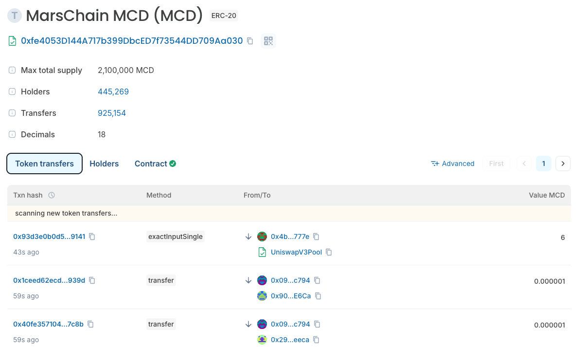 https://explorer.mars-chain.io/token/0xfe4053D144A717b399DbcED7f73544DD709Aa030